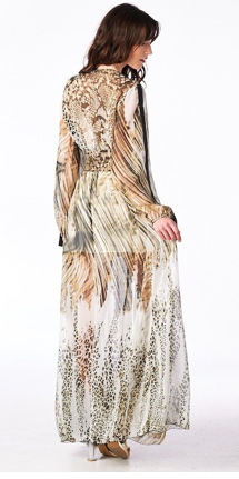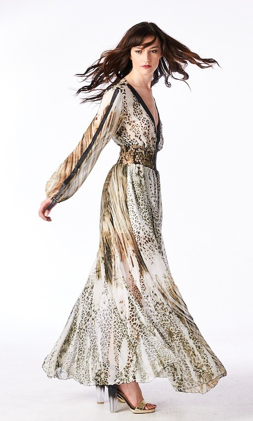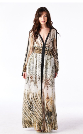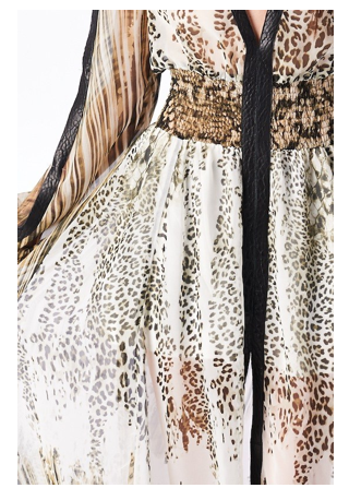 Amazing see through sheer jungle print dress with stretch waistband and black vegan lining down the plunging neckline and sleeves.