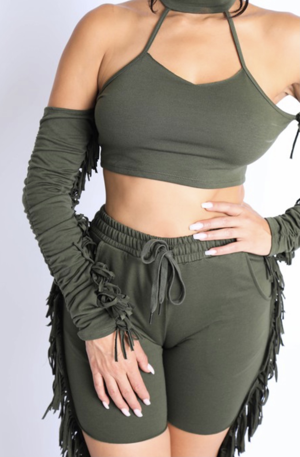 Sporty and sexy with this amazing two piece set. Very comfortable and ready for summer with cut out detail in the front and full pant leg in the back!!! Color: OLIVE