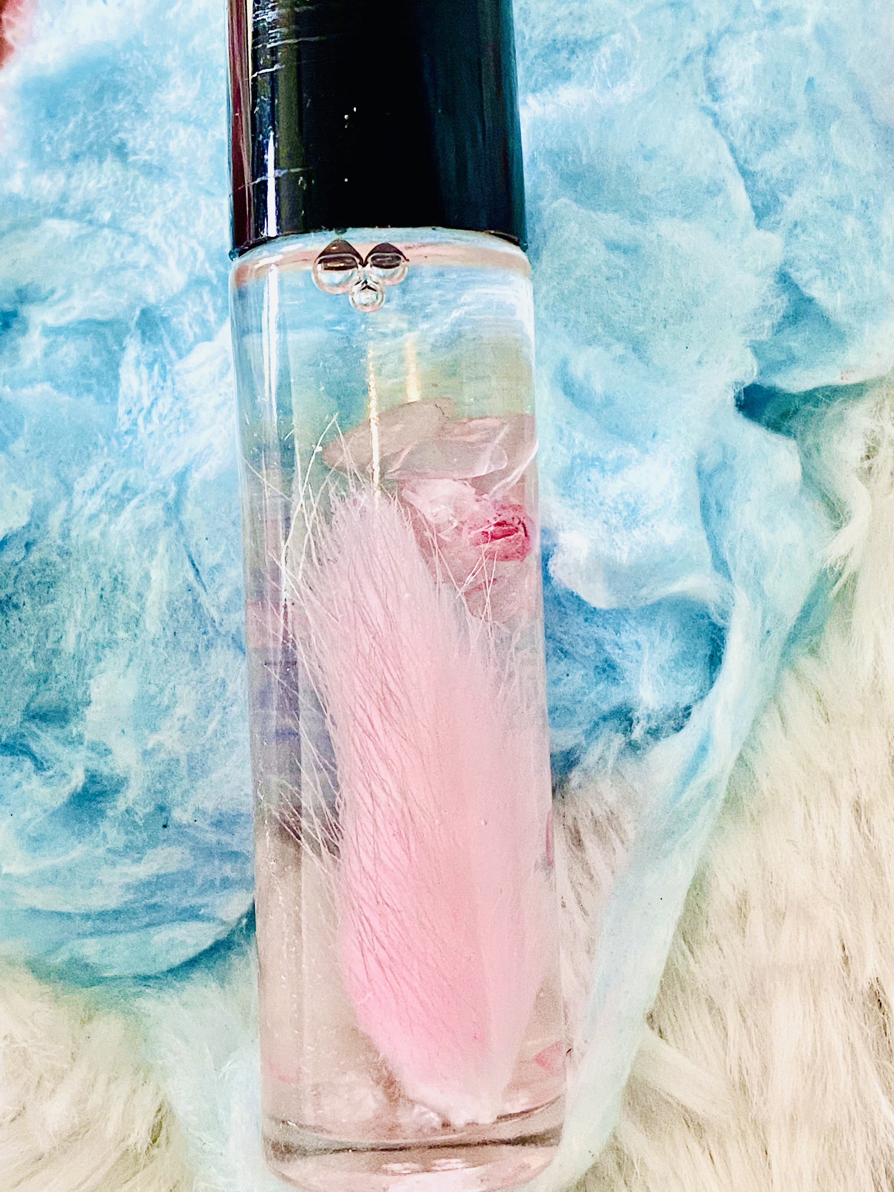 Oil has rose quartz chips and pink dried rabbit tail flowers