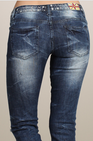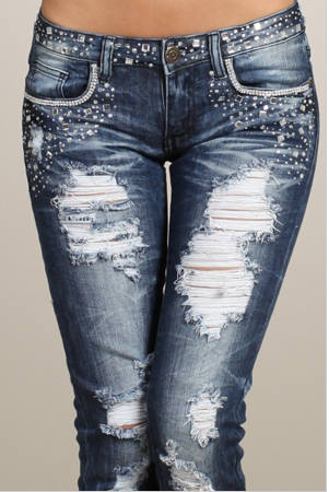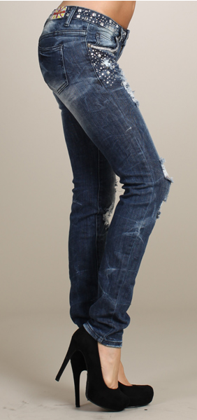 5 pocket skinny jeans with button and fly zip closure on front and belt loops at waist. Jeans feature ripped detail on front legs and jewel and stud embellishment allover.